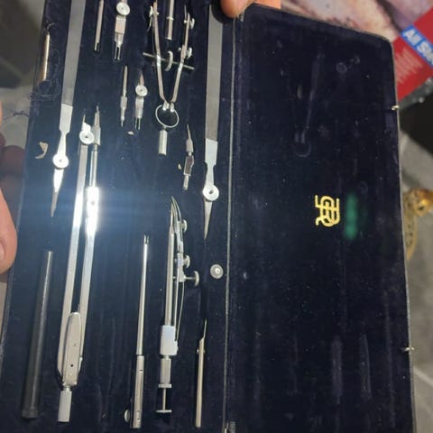 Vintage arkitekttegnesett, veldig lite brukt. Lokket har fått en liten skade, muligens under flytting. Ser ut til at det har vært et merke i den rektangulære ruten. Settet inneholder diverse tegneverktøy i fløyelsforet eske.