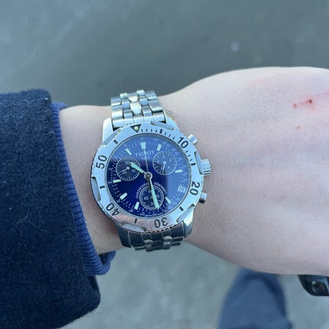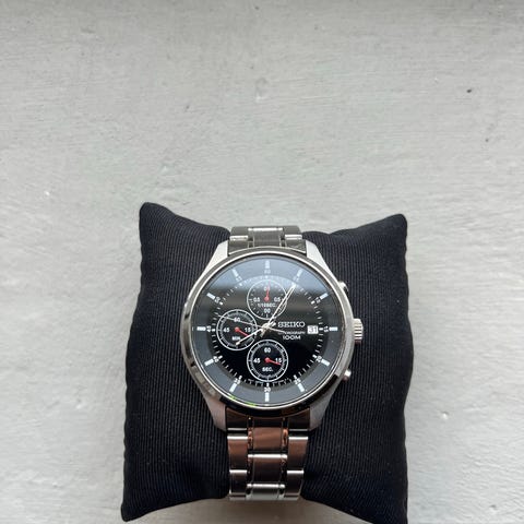 Seiko Chronograph (ref. 7T92-0PM, 36 mm) selges. Elegant og klassisk klokke i en mer kompakt størrelse som passer perfekt for smalere håndledd eller for deg som foretrekker et diskret og stilrent uttrykk.