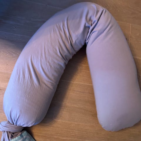 Puten er formet som en lang pøllepute og kan brukes både under graviditet og ved amming for støtte til rygg, mage eller barn. Den kan også brukes som ekstra støttepute i seng eller sofa. Nøytral beige farge som passer inn i de fleste interiører.