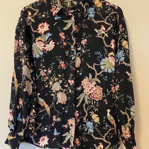 Hampton Republic 27 skjorte for dame i størrelse 42. Skjorten er laget av bomull og har et flerfarget blomstermønster på mørk blå bunn. Modellen har krage, lange ermer og knepping foran. Passer til hverdagsbruk eller mer pyntede anledninger, og kan kombineres med både bukser og skjørt.