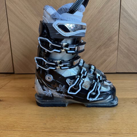 Alpinstøvler med yttersålelengde 285 mm. Støvlene har fire spenner og power strap øverst for god tilpasning rundt leggen. Fargekombinasjon svart og lilla med hvite detaljer og innersko i lys farge. Sålen har kraftig mønster for bedre feste ved gange på snø og is. Passer til bruk i alpinanlegg med vanlige alpinbindinger som er kompatible med denne sålelengden.