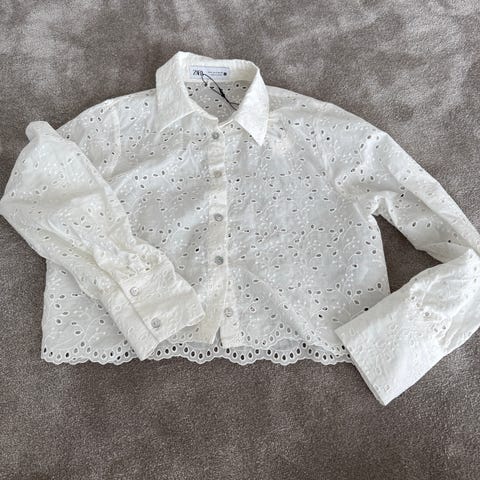 Zara skjorte i størrelse S, laget av bomull. Skjorten er hvit med pen detalj av brune knapper både foran og ved mansjettene.