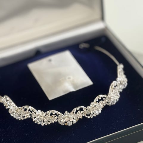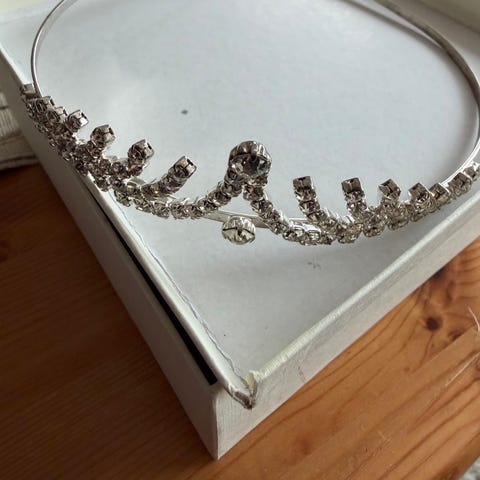 Tiara i sølvfarge med Sarowskystrass/perler. Utrolig flott, elegant og enkel i sin form.