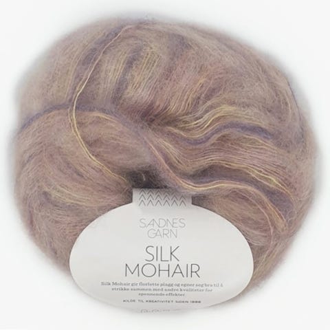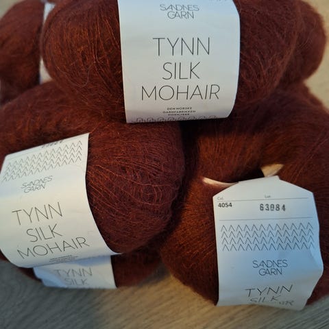 Sandnes silk mohair, lik innfarging, det ene nøstet mangler noen meter fordi det er strikket en prøvelapp