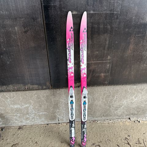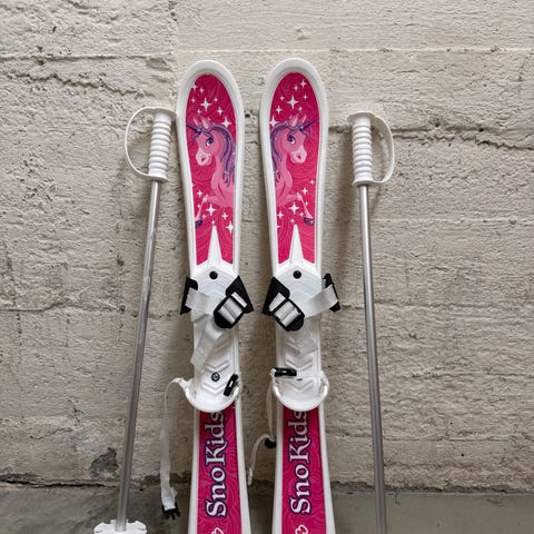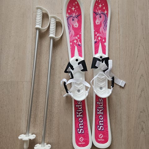 Skiene har integrerte reimer/bindinger som festes rundt skoen, og er beregnet for små barn som skal prøve ski for første gang.