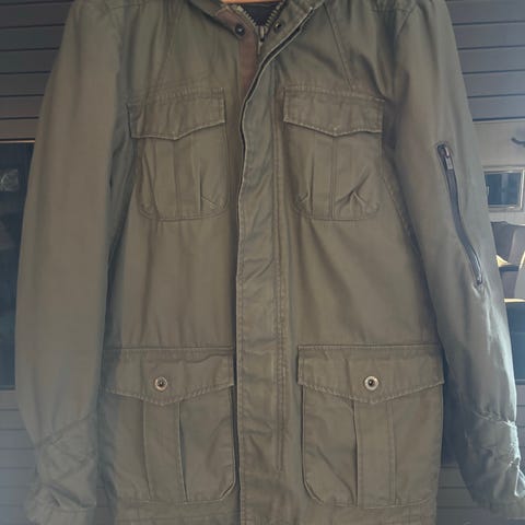 Jack & Jones jakke for herre i størrelse M. Jakken er grå i ullmateriale , fóret, med kontrastdetaljer i svart skinn på ermer, skuldre og krage. Den har glidelåslukking foran, to sidelommer med glidelås og en brystlomme med glidelås. Ribbekant nederst og ved erme. Passer som ytterjakke i overgangssesonger og til hverdagsbruk.