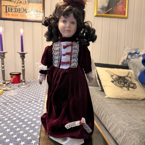 Gammel dukke fra 50 tallet med håndsydd kjole