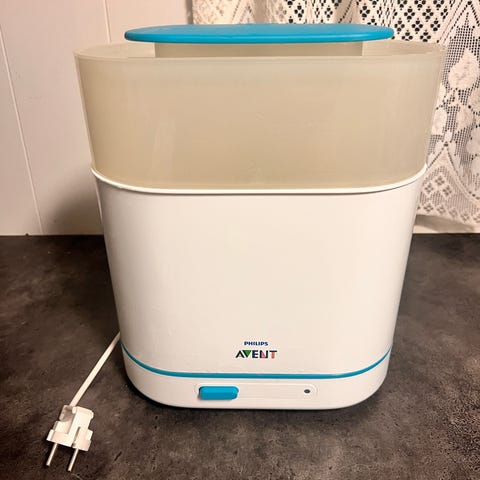 Philips AVENT dampsterilisator for babyutstyr i hvit og blå plast. Enheten er elektrisk og kobles til med medfølgende strømkabel. Består av base med varmeelement, gjennomsiktig beholder og lokk. Egnet for sterilisering av tåteflasker, smokker og annet babyutstyr ved hjelp av damp. Alle hoveddeler som vises på bildene følger med.