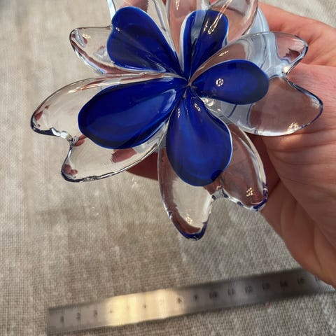 4 blomster og 2 sommerfugler i flerfarget glass. Blomstene er formet som stiliserte blomster med lange grønne stilker og kronblader i oransje, rødt, gult og hvitt. Sommerfugler i grønt og rødt med innslag av fargede prikker i glasset. De er relativt tunge og må stå i en tung vase dersom de skal stå sammen. Kan ellers brukes som dekorativt innslag i bukettblomster, eller som pynt på bord/hylle.
