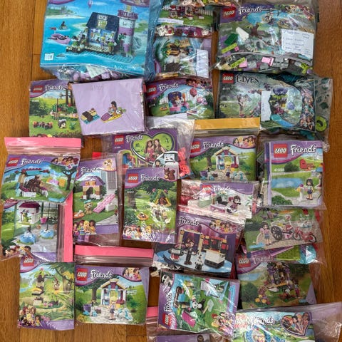 LEGO Friends byggesett med flere ulike modeller. Pakken inneholder blant annet et stort hus med flere etasjer og rom, en karusell/pariserhjul-lignende attraksjon, en mindre bygning, en hest med vogn og mindre tilbehørsbygninger. Selges som det er. Har ingen eske så det må hentes evt i pose.