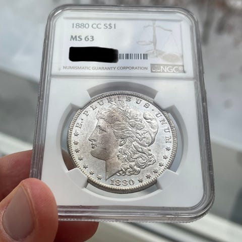 PCGS Morgan dollar mynt 1882 i sølv. Mynten er innkapslet og sertifisert av PCGS, med årgang 1882 og pålydende én dollar. Forsiden viser Liberty-motiv med teksten «E PLURIBUS UNUM» og årstallet 1882. Baksiden viser ørn med utspente vinger og teksten «UNITED STATES OF AMERICA – ONE DOLLAR». Egner seg som samlerobjekt innen amerikanske sølvmynter.