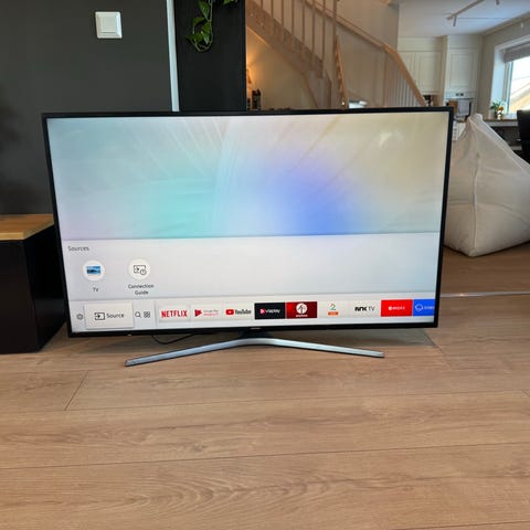 Samsung UE50F6275SB TV med 50 tommer skjerm i svart utførelse. Modellen har LED-skjerm og står på et kryssformet bordstativ i metall. Bakpanelet har tilkoblinger for eksterne enheter (se bilder for detaljer). TV-en kan brukes til vanlig TV-titting, strømming av innhold via tilkoblede enheter og som skjerm for spillkonsoller eller andre HDMI-kilder. Modellseddel på baksiden viser tekniske spesifikasjoner som effektforbruk og serienummer.