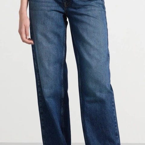 Jeans for dame i blå denim. Buksen er i størrelse 34 med livvidde W27. Modellen har vide ben og klassisk femlommers design med gylf og knapp i front. Materiale i denim gir et robust og slitesterkt plagg som passer til hverdagsbruk.