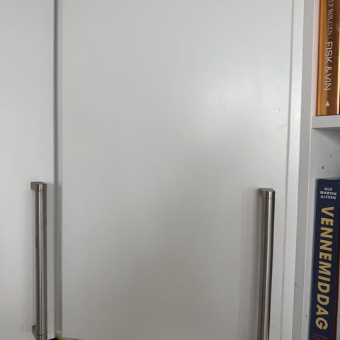 Gis bort mot henting og demontering. Hvite overskap til kjøkken med både tette dører og vitrinedører med sprosser. Skapene har en klassisk profilert front i lys farge og knotter i metall. Vitrineskapene har glasshyller på innsiden. Løsningen inkluderer hjørneskap og rette overskap som kan brukes over benk eller vaskesone på kjøkken. Passer til montering som komplett overskapsrekke eller enkeltvis etter behov.
