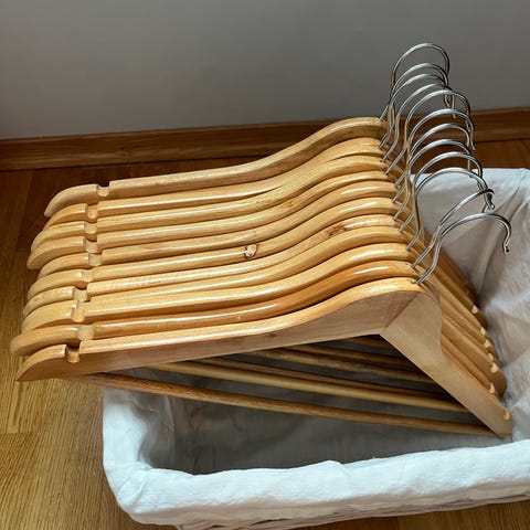 Klesstativ av type valettstol i tre med naturfarget finish. Stativet har en bred kleshenger øverst til jakke eller skjorte, flere tverrstenger til bukser, skjerf eller andre plagg, samt støtteben som holder stativet stabilt på gulvet. Øverst er det metallkrok for oppheng. Egner seg til organisering av klær på soverom, garderobe eller gang.