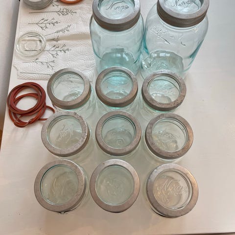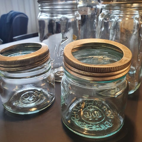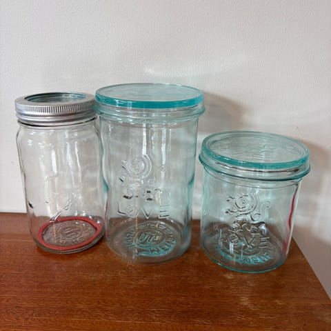 Hadeland Glassverk Norgesglass oppbevaringsglass i klart glass med lokk i tre. Settet består av sylindriske glass i ulike høyder, alle med preget «Norge»-logo på siden. Glassene egner seg til oppbevaring av tørre matvarer eller annet innhold på kjøkkenet eller i hjemmet. Klart glass gjør det enkelt å se innholdet, og lokkene i tre ligger oppå åpningen for enkel tilgang.