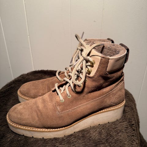 Gant støvler i størrelse 39. Støvlene er laget i semsket skinn i en beige/brun farge med lys såle og lisser. Modellen har snøring foran, hempe bak og polstret parti rundt ankelen. Passer til hverdagsbruk i kjøligere vær. Ingen spesifikk modellbetegnelse er oppgitt.
