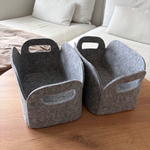 Pent brukt mørkegrå filtkurv.