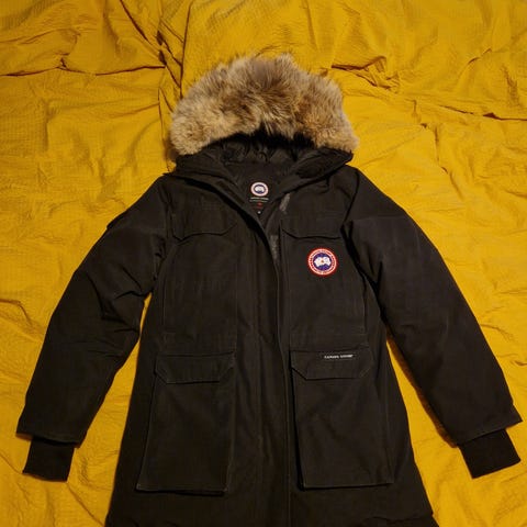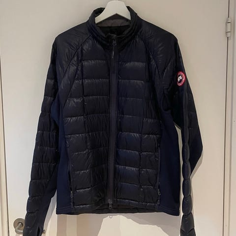 Canada Goose dunjakke for herre i størrelse L. Jakken er svart og fylt med dun. Den har hette, glidelås med knappestolpe foran og Canada Goose-logo på ermet. Egnet som ytterjakke i kaldt vær.