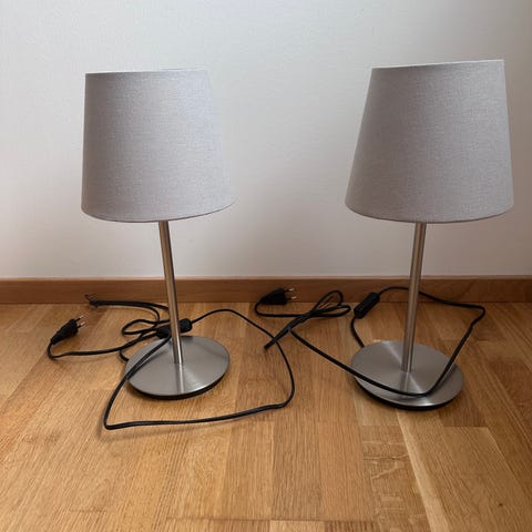 50 kr per lampe. IKEA bordlamper i ulike varianter. Lampene har skjermer i hvit plast/tekstil og fot i hvit eller oransje plast/metall. Flere av lampene har rund fot, én har stativfot med tre ben. Alle lampene har ledning med bryter og er beregnet for innendørs bruk, for eksempel på nattbord, kommode eller skrivebord. Pærer følger ikke nødvendigvis med og kan velges etter ønsket lysstyrke og sokkeltype som passer til lampene.