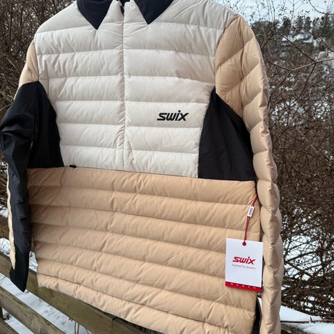 Swix jakke for dame i størrelse L. Jakken er svart med rosa glidelås og refleksdetaljer på bryst og ermer. Glidelås i front og elastiske mansjetter. Egnet som ytterjakke til trening og fritid, for eksempel løping eller langrenn