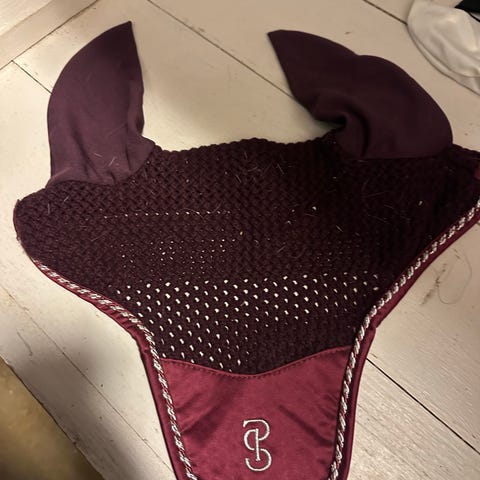 PS of Sweden med matchende ørehette og sjabrak i dyp blått. Ørehetten har heklet parti med stoff over ørene. Sett egnet til bruk ved ridning der man ønsker ørebeskyttelse og underlag mellom sal og hesterygg.