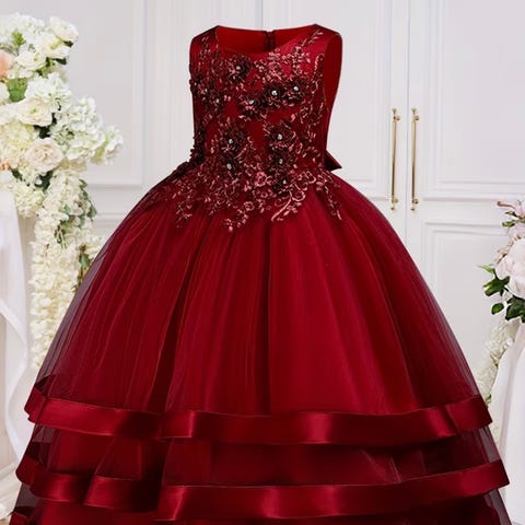 Jente kjole i størrelse 130 i lilla flerfarget tonet stoff. Kjolen har ermeløst liv med transparent øvre del og dekor foran med paljetter og mønster. Kjolen er langt og vidt med flere lag tyll i lilla og pastellfarger, samt små dekorative detaljer nederst. Bak har kjolen glidelås og stor knyte-sløyfe i midjen. Egnet til bruk ved selskap, fest, bryllup eller andre anledninger der man ønsker en lang kjole til jente.