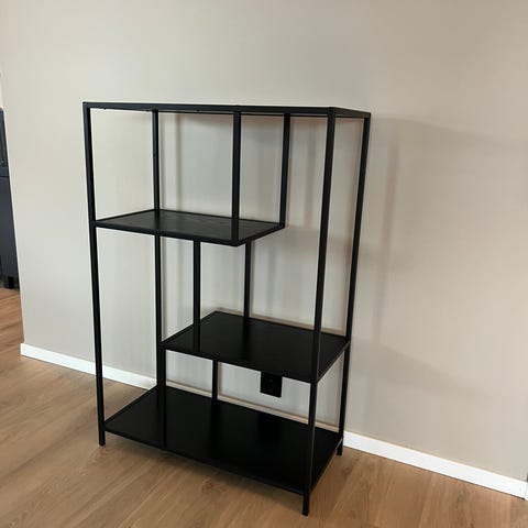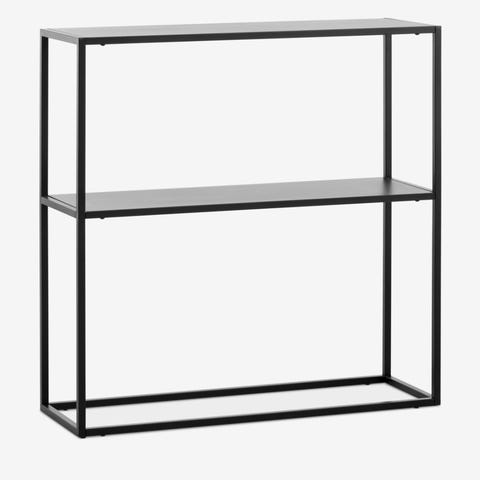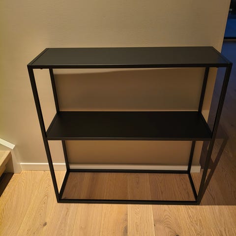 Jysk konsollbord i metall med svart finish. Bordet har to hyller og en åpen, rektangulær ramme. Egnet som avlastningsbord i gang, stue eller andre rom der det er behov for ekstra hylleplass langs veggen.