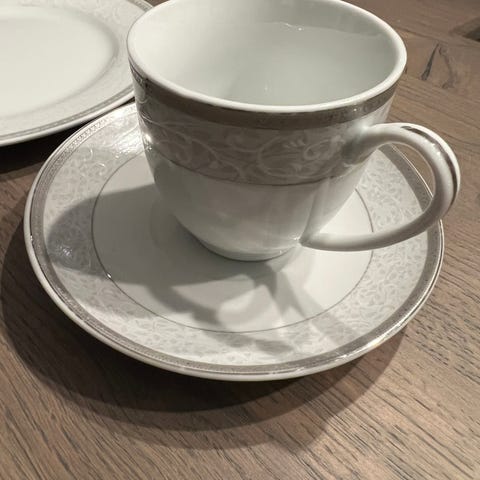 Kaffeservise til seks personer. Hver tallerken /kopp har et eget bygg på seg.