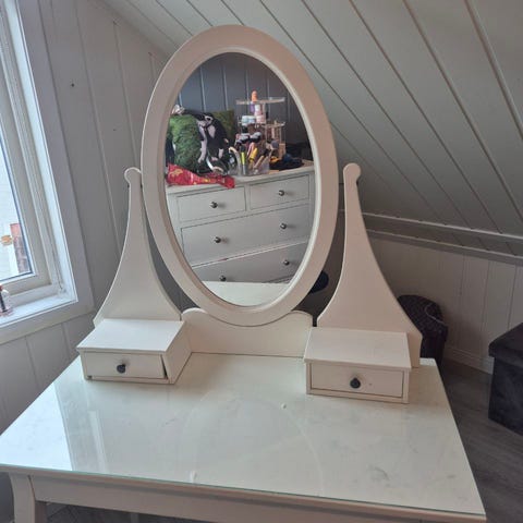 Hvitmalt kommode med speil i god stand. Tre store- og 2 små skuffer.