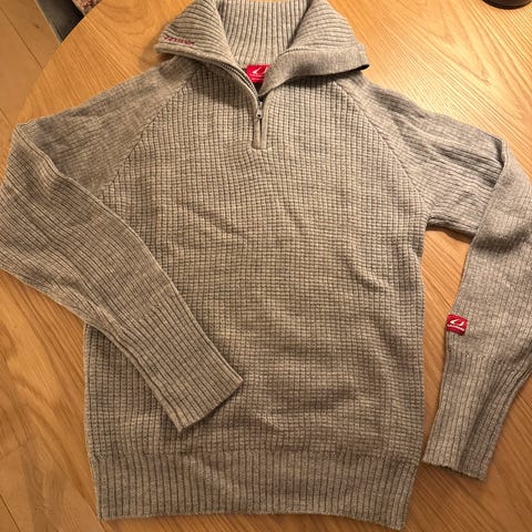 Ulvang ullgenser i størrelse S. Genseren er grå og strikket i ull, med høy hals og glidelås i front.