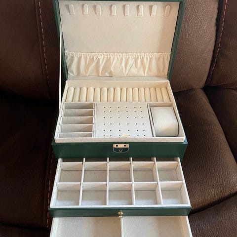 Skrinet er kledd i burgunderrødt kunstskinn (ofte referert til som "burgundy leatherette") og har messinghengsler på fremsiden. Interiøret er foret med rød fløyel. Speil i lokket og et uttakbart brett med ulike rom. Nøkkel for å låse skrinet følger med.