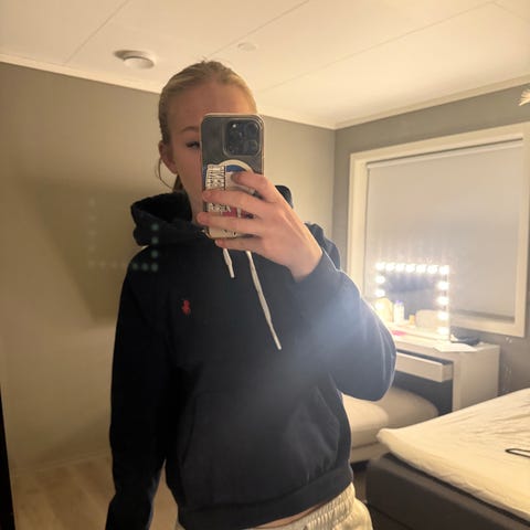 Polo Ralph Lauren hettejakke i (dame)størrelse M. Hettejakken er blå og laget i bomull. Modellen har glidelås i front, justerbar hette med snøring og lommer foran. Klassisk Polo Ralph Lauren-logo brodert på brystet.