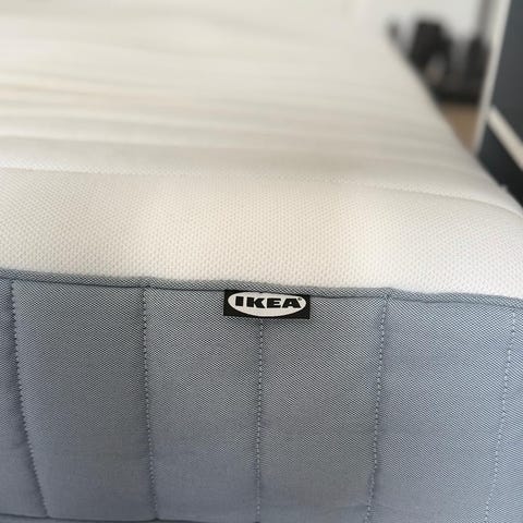 IKEA madrass i nøytrale farger med hvit overflate og grå sider. Madrassen har quiltet overflate og bærehåndtak på sidene som gjør den enklere å flytte og vende. Passer til standard sengestamme i tilsvarende størrelse. Egnet som hovedmadrass i soverom eller gjesterom.
