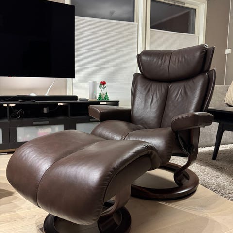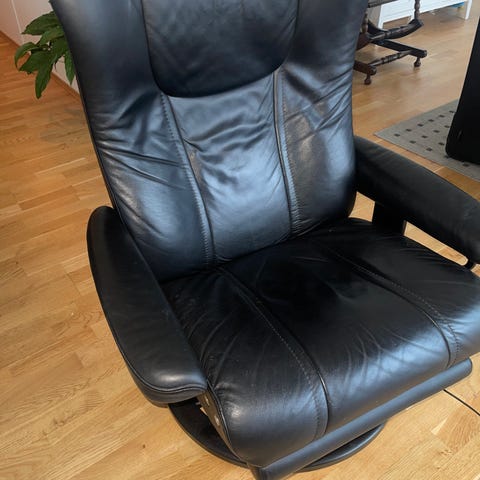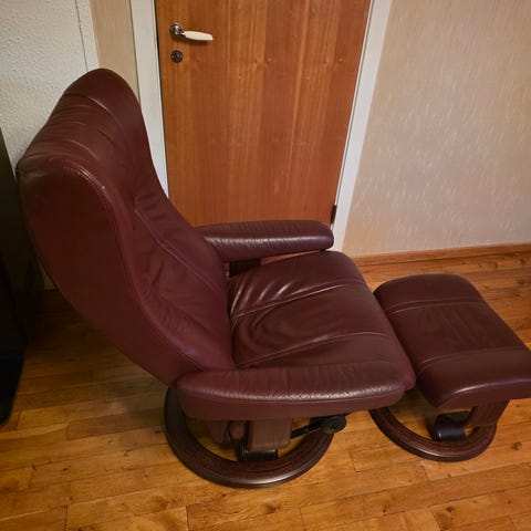 To stk reclinere/stressless med fotskammel fra Ekornes til salgs. Stolene ser pent brukte ut, men hver stol har bittelitt slitasje i sitteregionen, se bilder. Stolene er i en burgunder farge. Kan selges samlet for 4000 kr eller hver for seg for 2000 kr.