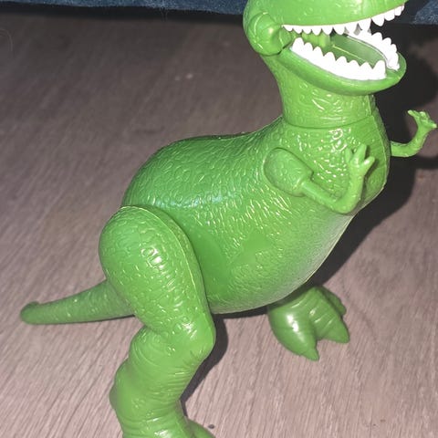 Dinosaur figur leke i brun plast med grønne detaljer. Figuren forestiller en rovdinosaur med lang hale og klør på hender og føtter. Egnet som lekefigur for barn eller samlere.