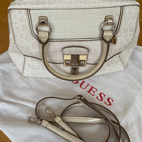 Guess håndveske i svart kunstlær for dame. Vesken har to korte hanker og avtakbar/skulderrem, samt preget Guess-logo på fronten. Lukkes med glidelås øverst. Metall-detaljer i sølvfarge og tilhørende nøkkelring-/tagg med Guess-logo. Leveres med stoffpose fra Guess, som kan brukes til oppbevaring av vesken.