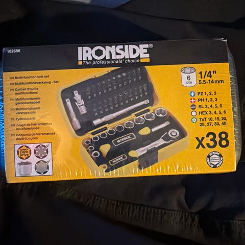 Innhold: 1 stk Skrallehandtak 10 stk Piper (5.5, 6, 7, 8, 9, 10, 11, 12, 13 og 14 mm) 2 stk Forlengere (50 og 100 mm) 1 stk Univerversalhảndtak 1 stk Universalledd 1 stk Bitsadapter 14"x 14" 22 stk Bits (PH 1-2x2-3, PZ 1-2-3, TXT 10-15-20-25-27-30-40, Innvendig sekskant; 3-4-5-6, Spor 3-4-5-6)