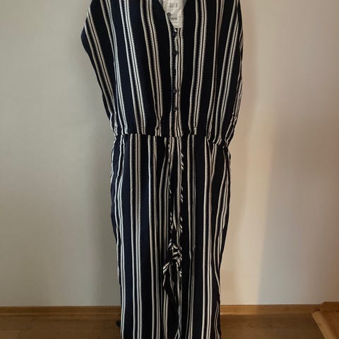 Kul Monki buksedress i størrelse S (vil tro den passer str. M og). Lengde ca. 140 cm. Plagget er laget av polyester og har et flerfarget, stripete mønster i lyse og mørke toner. Buksedressen har korte ermer, v-utringning foran og åpning med knapp bak i nakken. Livet er lett innsnevret for en mer definert passform, og bena er rette og vide. Materialet er lett og faller mykt.