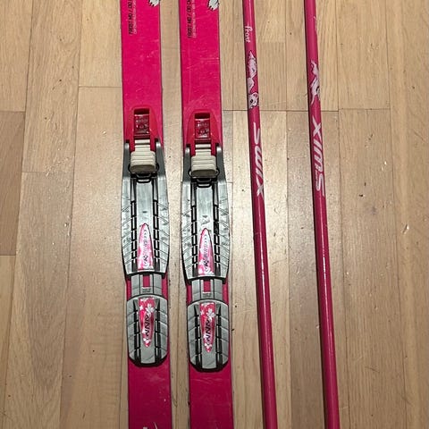 Stiga Twintip barneski i blå farge. Skiene har integrerte plastbindinger tilpasset barn, med stropp foran og bak for feste rundt sko eller støvler. Undersiden er glatt for lek og enkel glid på snø. Egner seg til bruk i bakke, hage eller på lekeområder for barn som vil prøve ski på en enkel måte.
