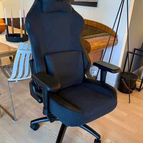 Pent brukt gamingstol fra Svive. Stolen er komfortabel å sitte i og fungerer ypperlig til gaming eller kontorarbeid. Kjøpt i 2021 for 2200 kr. Selges grunnet plassmangel. Må hentes på Stovner.