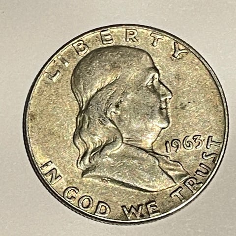 USA Franklin half dollar mynt 1962 i sølv. Forsiden viser portrett av Benjamin Franklin med teksten «Liberty» og «In God We Trust», samt årstall 1962. Baksiden har motiv av Liberty Bell og påskriften «United States of America» og «Half Dollar». Mynten leveres i kapsel slik den vises på bildene. Egner seg som samlerobjekt eller som del av en myntsamling med amerikanske sølvmynter.
