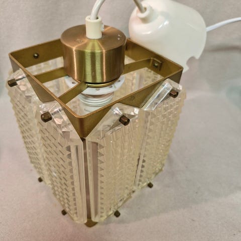 Laget på 60-tallet i messingutførelse med åtte ravfargede glass som gir meget pent uttrykk. 30 cm diameter, cirka totalhøyde 25 cm. Fungerer som den skal og er hel og pen, men med den har noen småriper. Disse vil nok ikke synes når lampen henger oppe, men selger til en meget god pris pga dette.