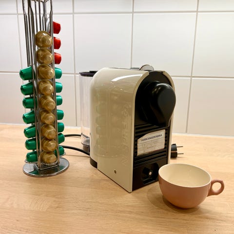 Nespresso kaffemaskin kapselmaskin i svart utførelse. Maskinen har vannbeholder bak og dryppbrett foran. Egnet for bruk med Nespresso-kapsler til tilberedning av kaffe og espresso hjemme eller på kontor. Kompakt modell som tar liten plass på benken.