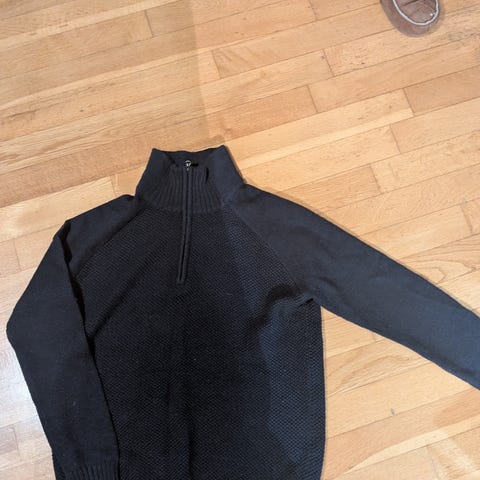 Litt brukt Dæhlie ullgenser i størrelse S. Genseren er grå og laget i ull, med halv glidelås i halsen. Strikket struktur i stoffet og ribbestrikkede ermer.