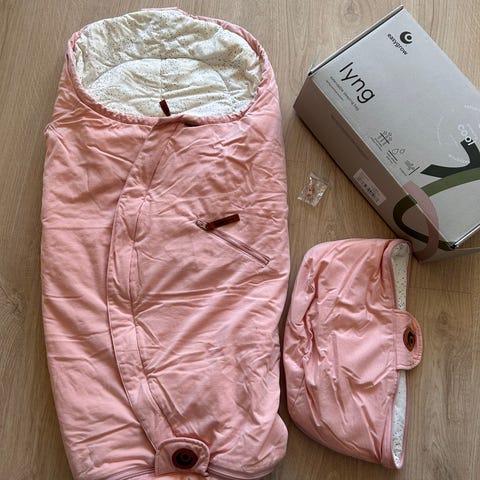 Pent brukt vognpose i lyserosa farge. Forlengelsesdel medfølger.