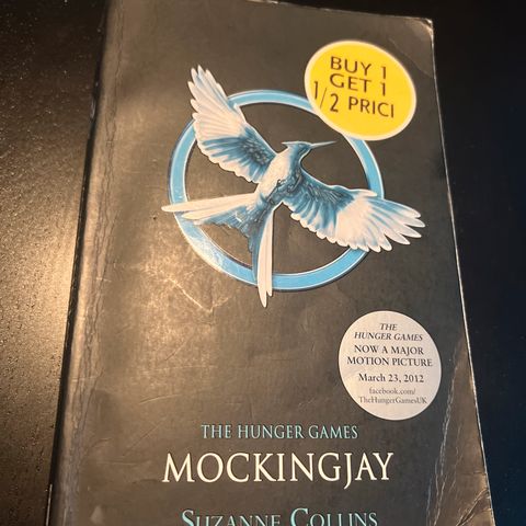 Boken er tredje del i The Hunger Games-serien. Pocketutgave med svart omslag og motiv av en fugl i sirkel på forsiden. Tekst på engelsk.