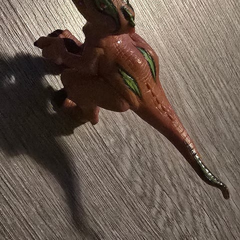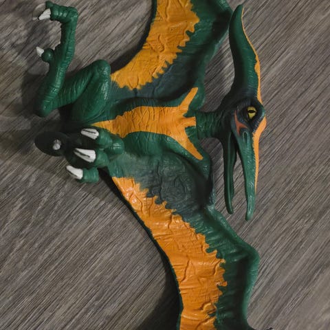 Dinosaur lekefigur i grønn plast med svarte og oransje detaljer. Figuren forestiller en tobeint dinosaur med lang hale og markerte klør. Egner seg som lekefigur for barn eller som samlerfigur og dekorasjon. Størrelse er omtrentlig som en vanlig liten lekefigur, egnet til bruk sammen med andre dinosaur- eller dyrefigurer.