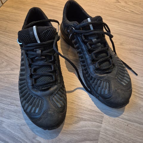 "Energetics joggesko i størrelse 43. Skoene er svarte med hvit såle og snøring med mønstrede lisser. Overdelen er i tekstil og syntetisk materiale, med polstret hælparti og pløse for økt komfort. Yttersålen er i syntetisk materiale med mønster for bedre grep. Passer til hverdagsbruk og lett trening."