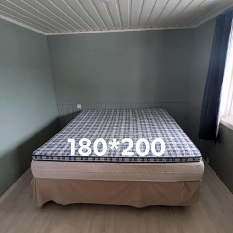 Sengen er i god stand, med individuelle liggesoner og overmadrass med memory foam. Sengeramme av lyst tre, tror det er furu. Må hentes